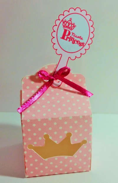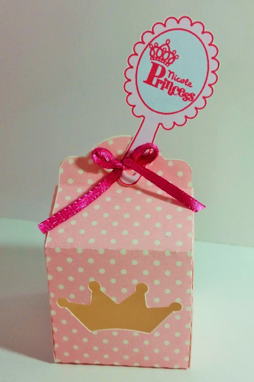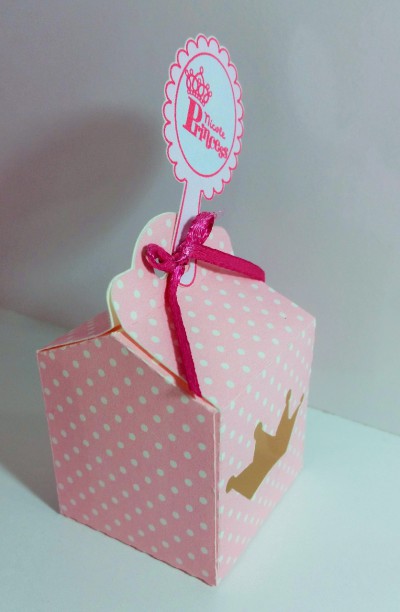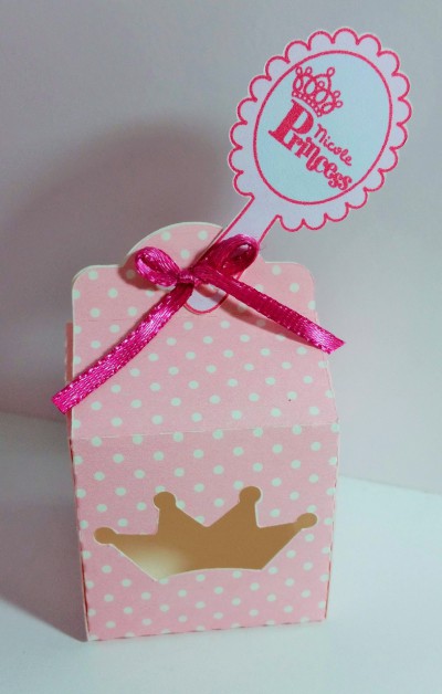Caixinha para bombom personalizado do tema princesa com recorte de coroa e tag
